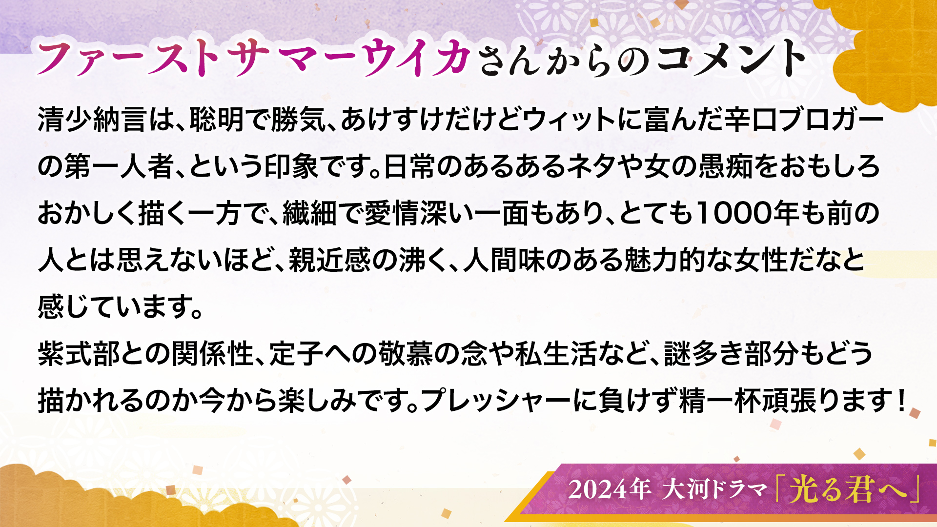 2024年大河ドラマ 光る君へ 作 大石静さん 主演 吉高由里子さん Nhk